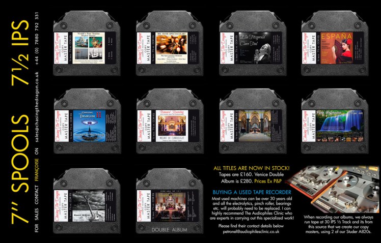 Well, audiophile label Chasing The Dragon is aware of your plight and has come to your aid. All of the label’s recordings on copy master tape are now available on 7-inch reels at 7.5ips, in addition to the usual 10.5-inch / 15ips tapes.