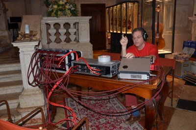 Each morning, the digital files from the previous day were downloaded from the Nagra VI and the two Tascam digital recorders to a hard disk to make space for the day’s new recordings. Daily rehearsal sessions were absolutely invaluable. Apart from the obvious benefits of being able to setup the equipment, adjust the levels and ensure everything was working correctly, rehearsals allowed any unforeseen issues to be corrected before the actual recordings. For example, on one occasion the weighty U47 microphone started to move down on the stand during Davide’s rehearsal of Vivaldi’s ‘La Follia’. Two people immediately tightened the microphone clamp, and the problem never reoccurred. Other issues that had to be addressed related to health and safety, with plenty of Gaffer tape being used to secure cables that ran rather precariously over the walkways.