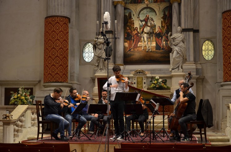 The first movement concluded and the audience spontaneously burst into a round of enthusiastic applause. Unfortunately, this was not something that could be edited out later as doing so would have a detrimental effect on the decay of the final notes of the piece. Aware of this, Davide the cellist thoughtfully raised his hand at the end of the second movement to make sure this was not repeated. The audience remained silent for the rest of ‘Spring’ and only applauded again at the end of ‘Summer’, when the solo violinist swapped with another member of the orchestra who then played the remaining two of the set of four concertos.