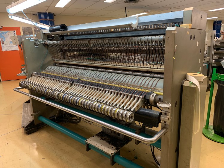 The photos below shows the very cool trident ¼” slitting machine; in the third image (far right) the tape, which has already been separated up and down, is then directed left and right to create four ‘fans’ of tape heading to the receiving trident reels.
