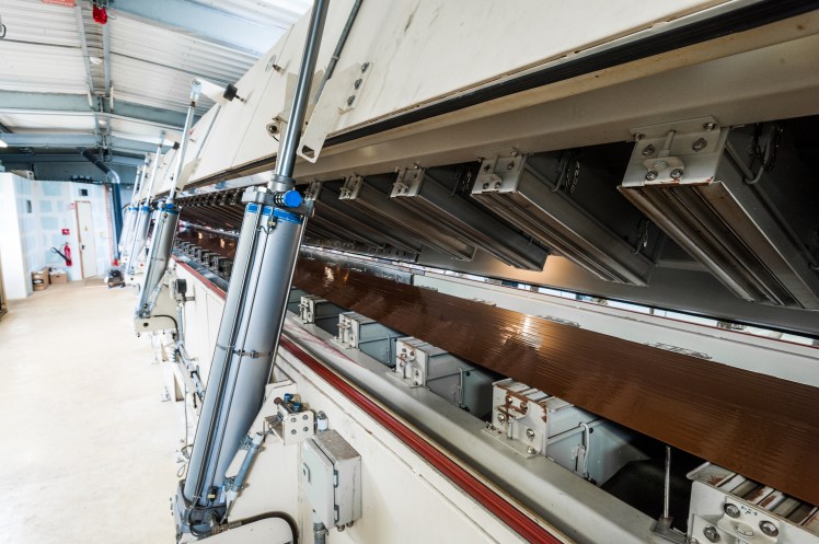 At this point the tape is still a 66cm-wide sheet. So the completion of this part of the process results in rolls of tape, 66cm wide, of varying formulations and thicknesses. These ‘jumbo’ rolls are now ready for ‘slitting’ – in other words, being cut into the various required tape widths.