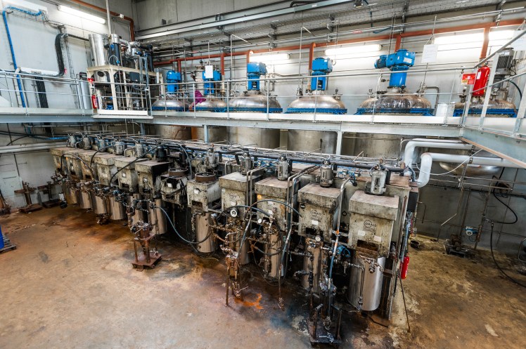 Above we can see four brown oxide magnetic pigment canisters, alongside drums of chemicals and solvents – both new and recycled (more on which later)…