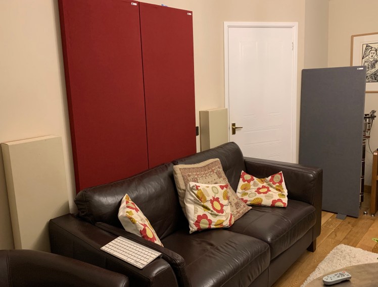 There was only one problem: the number and arrangement of acoustic panels required to achieve this sound quality was, quite frankly, completely non-domestic. I had panels behind the sofa against the wall (which were OK, at a push they could possibly pass for abstract expressionist art). I had a panel to one side against the right hand wall (possibly OK again). I had a panel to the other side, on the left in front of the turntable (getting trickier now, because I had to lean around it to cue up a record, or else move the panel each time). I also had panels huddled around the rear and outer faces of the loudspeakers (again, tricky, you had to navigate these ones to walk across the room without bumping into other things). Oh, and my sofa cushions made a makeshift bass trap in a rear corner. And a jumper was hung over the television mounted on the front wall.