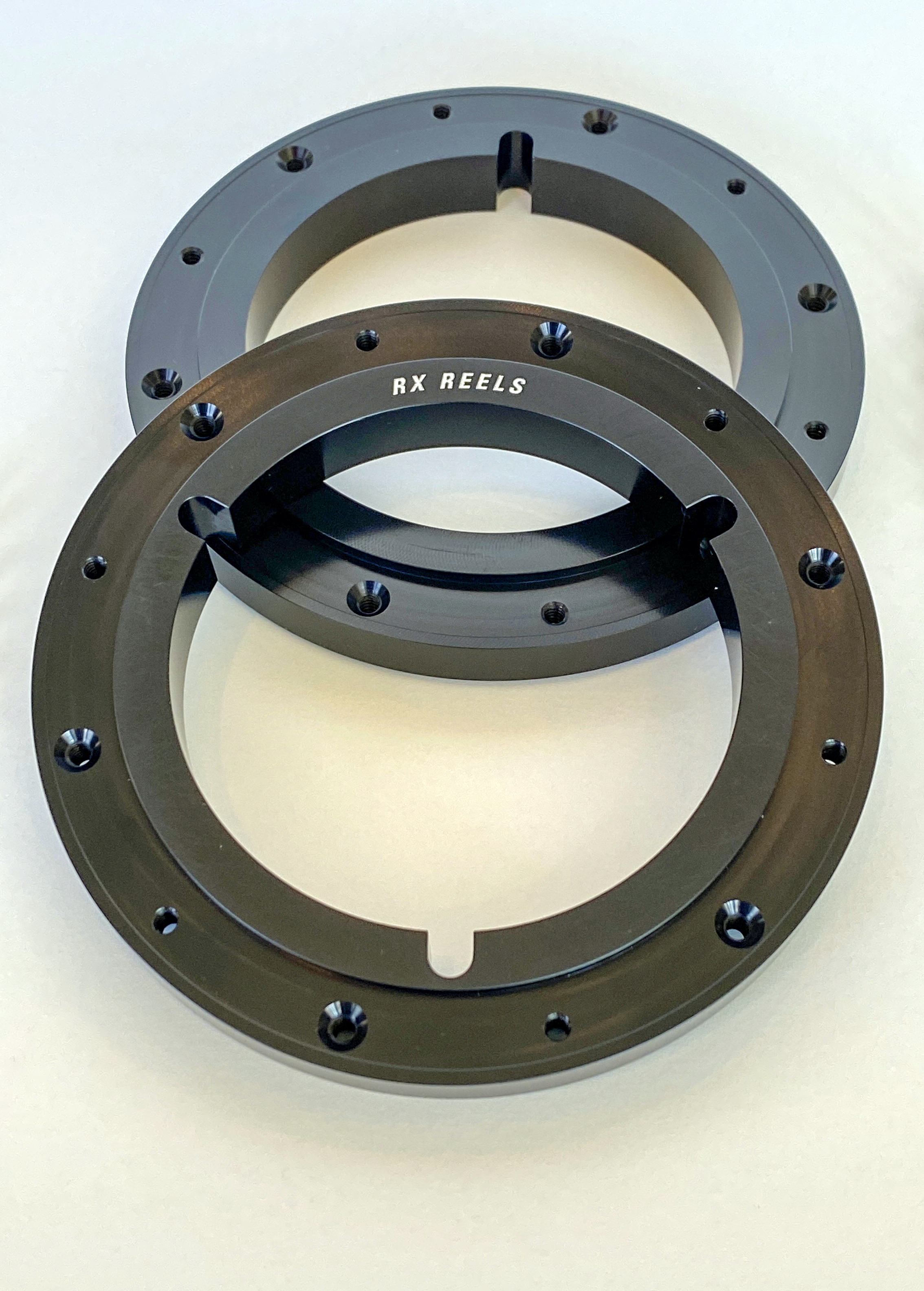 At the centre of each reel is a custom-made, professional-style NAB hub. Commercially available hubs are often designed to be inexpensive to produce and are typically joined to the flanges by just three screws. RX Reels’ solid aluminium hubs are precision made to tolerances below two thousands of an inch, and each 2.3mm thick flange is held to the hub with six screws (so twelve screws in all) for a secure fit.