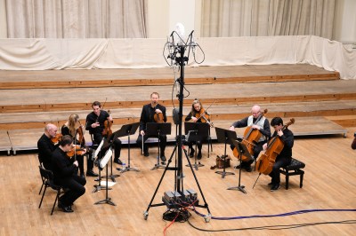 In addition to the Mendelssohn Octet, a single performance of ‘Two Guitars’ was recorded in order to allow the listener to compare a number of different recording techniques. A total of eight microphones were used in different configurations so that the same performance could be recorded in different ways: