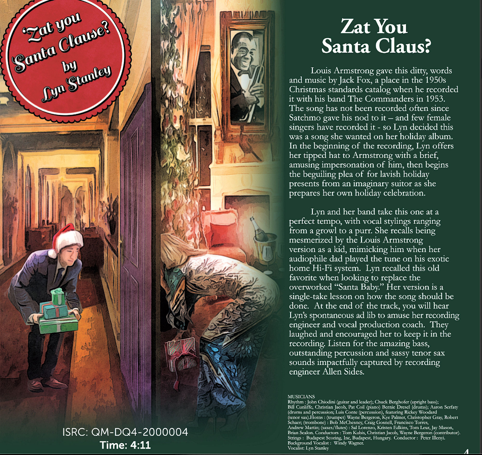 I must also commend the new arrangements of some old Christmas favourites, such as Lyn’s unique take on ‘Zat You Santa Claus’ (Track 1 of Tape 1). The big band opening track of this Louis Armstrong classic from 1953 is given a sultry twist. ‘Come Dance With Me’ has a Latin ‘cha-cha-cha’ rhythm, and ‘It’s Magic’ is given a lovely rumba treatment.